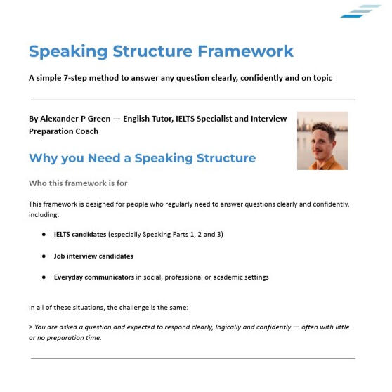 > A simple 7-step framework you can use immediately> How each step helps make your English clearer and more effective> Examples you can practise with (IELTS + real-world contexts)> A structure that supports speaking and writing (because good structure transfers)Get the 7-Step Speaking Structure Framework (PDF)> Instant access — practical, clear, and ready to use.
